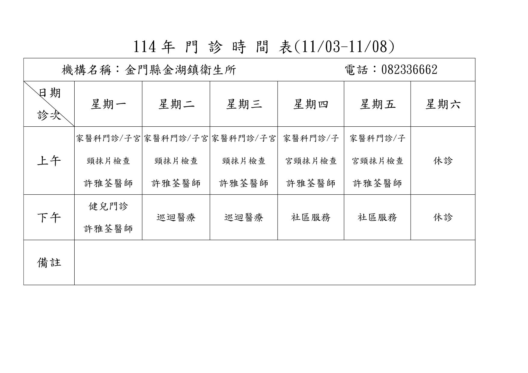 114年1~6月金門縣金湖鎮衛生所健兒門診時間表