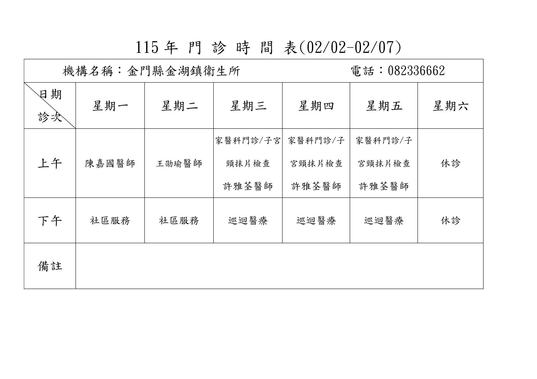 115年1~3月金湖鎮衛生所健兒門診時間表