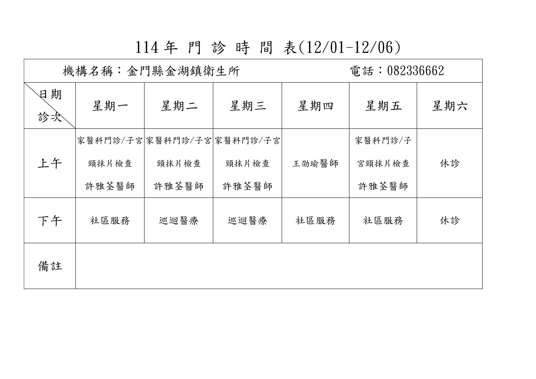 114年1~6月金門縣金湖鎮衛生所健兒門診時間表