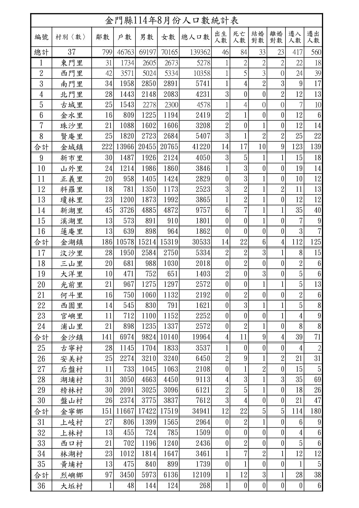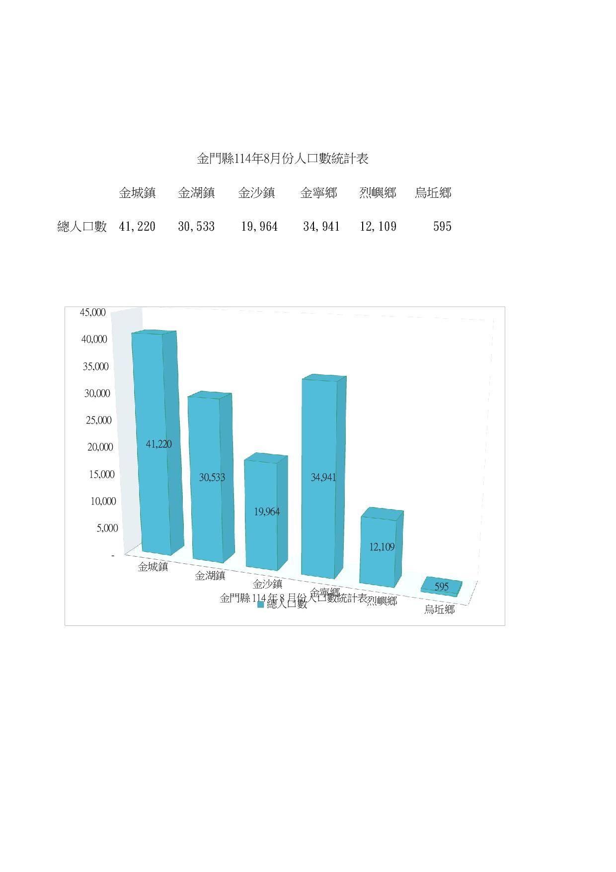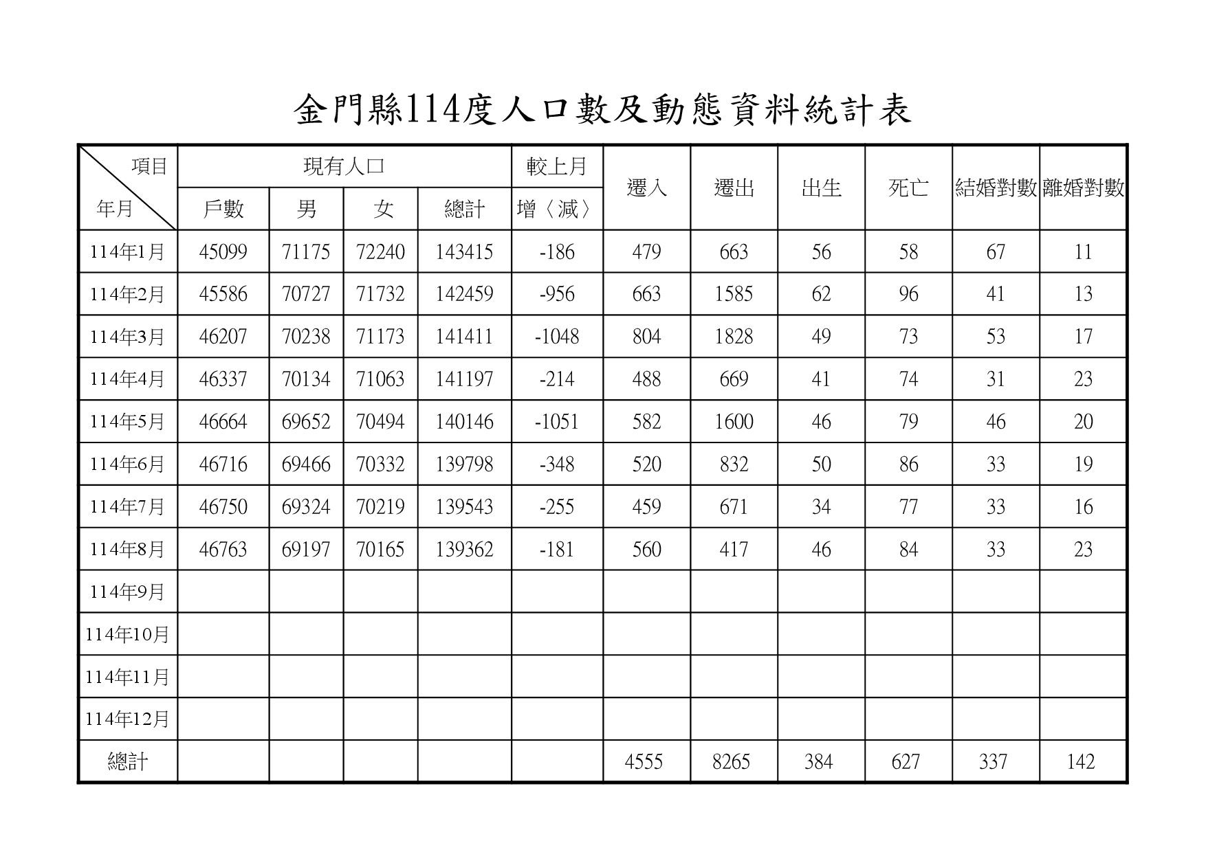 金門縣114年8月份人口數統計表、人口異動表、人口圖表