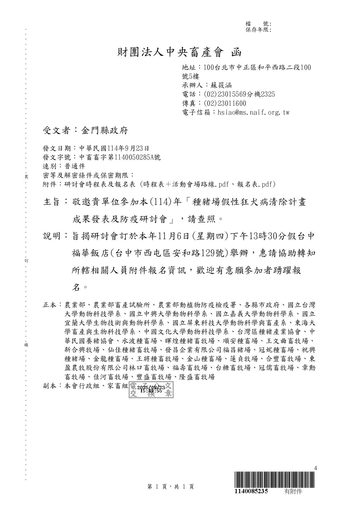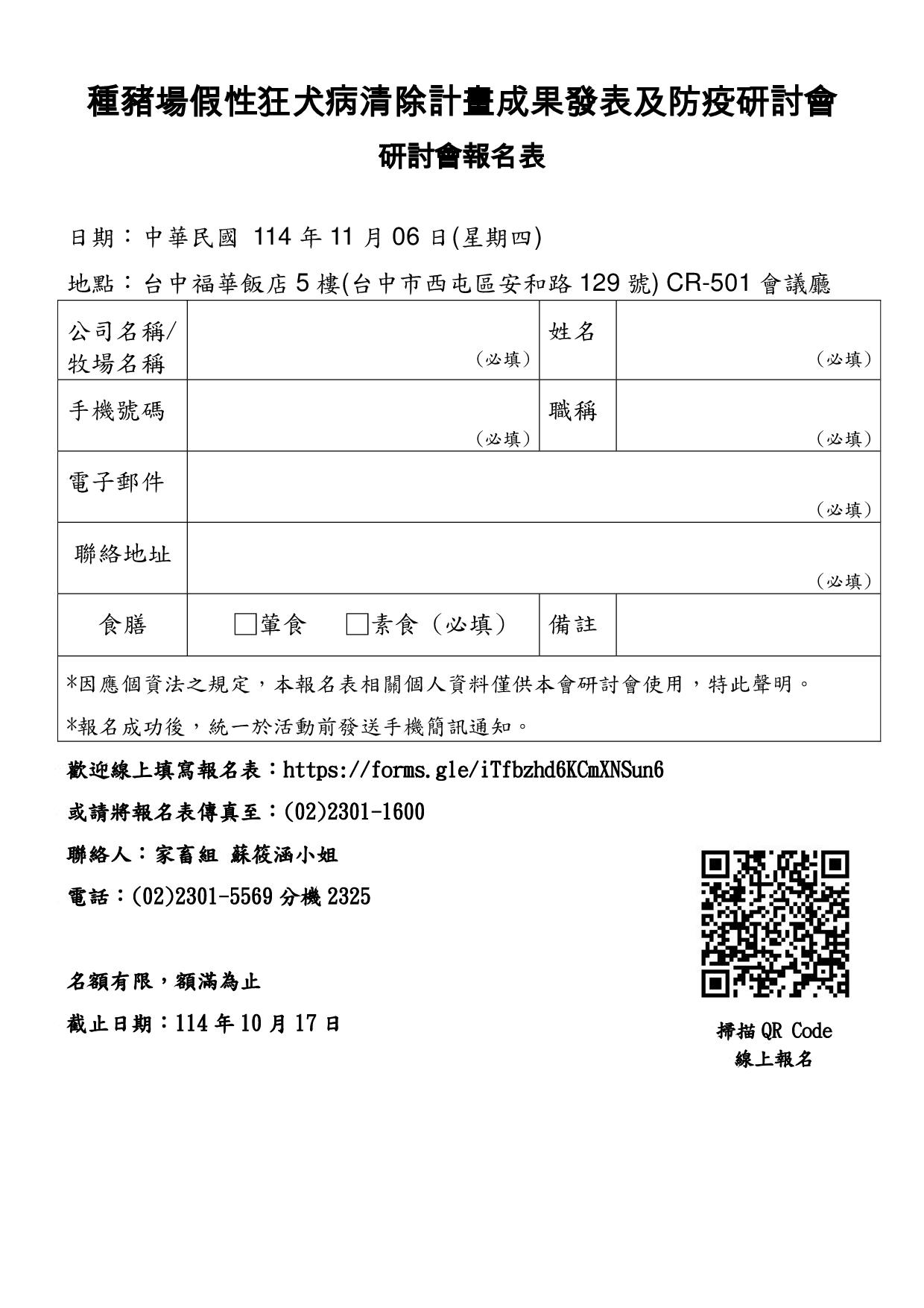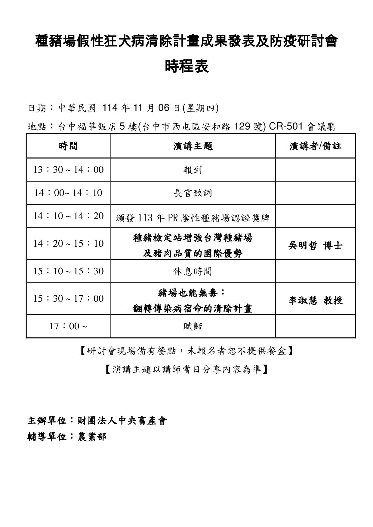 財團法人中央畜產會辦理114年種豬場假性狂犬病清除計畫成果發表及防疫研討會 研討會訂於本年11月6日(星期四)下午13時30分假台中福華飯店(台中市西屯區安和路129號)舉辦 歡迎有意願參加者踴躍報名。